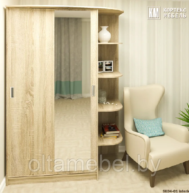 Компактный 2-х дверный шкаф для одежды на два отделения равной ширины с боковой консолью. Платяное отделение оборудовано штангой для хранения одежды на плечиках, нижней полкой и антресолью. Второе отделение имеет 4 полки, 3 из которых съёмные. Боковая консоль с 4-мя фиксированными полками удобна для размещения небольших предметов интерьера и часто используемых вещей. Модель ЛАГУНА ШК04-01 исполнена с одним зеркалом на правой двери. Зеркала крепятся в производственных условиях и поставляются в наклеенном состоянии.